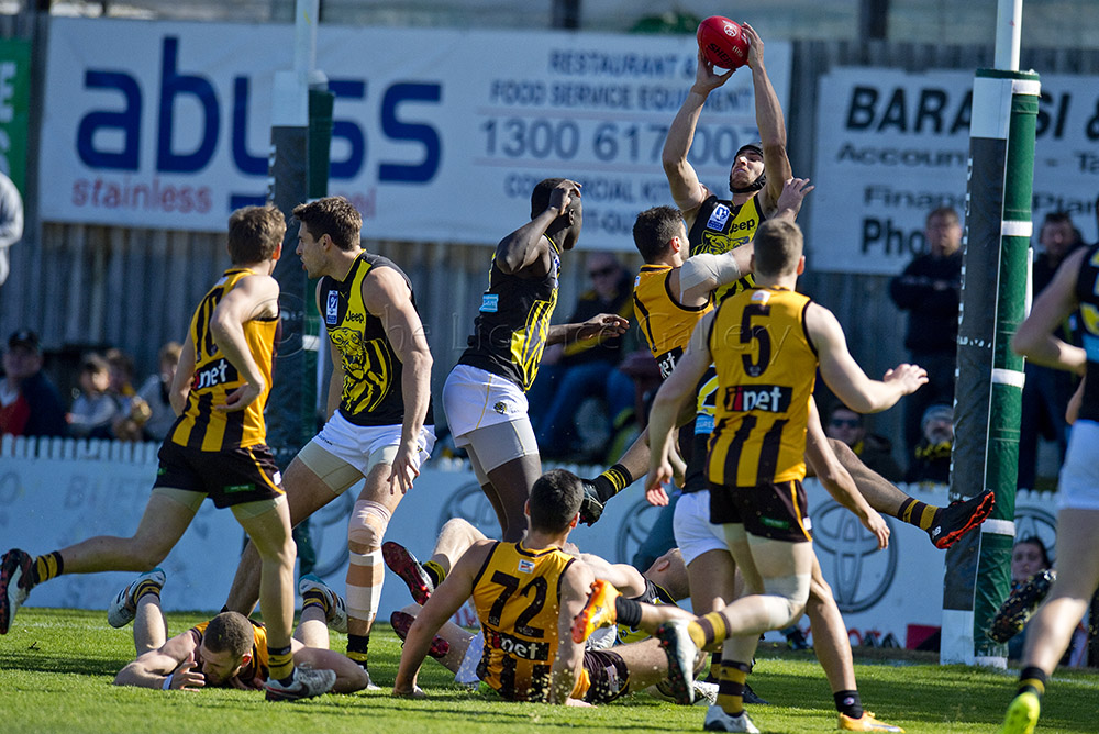 Ben Griffiths marks in the goalsquare for the Tigers as the Hawks fall around him.