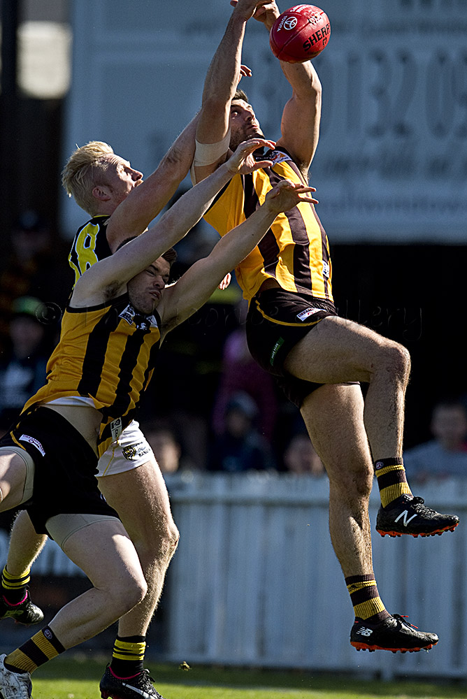 Tiger big man, Ivan Maric, wasn't letting Hawk's pair, Mitchell O'Donnell (4) and Marc Pittonet disrupt the Richmond onslaught.