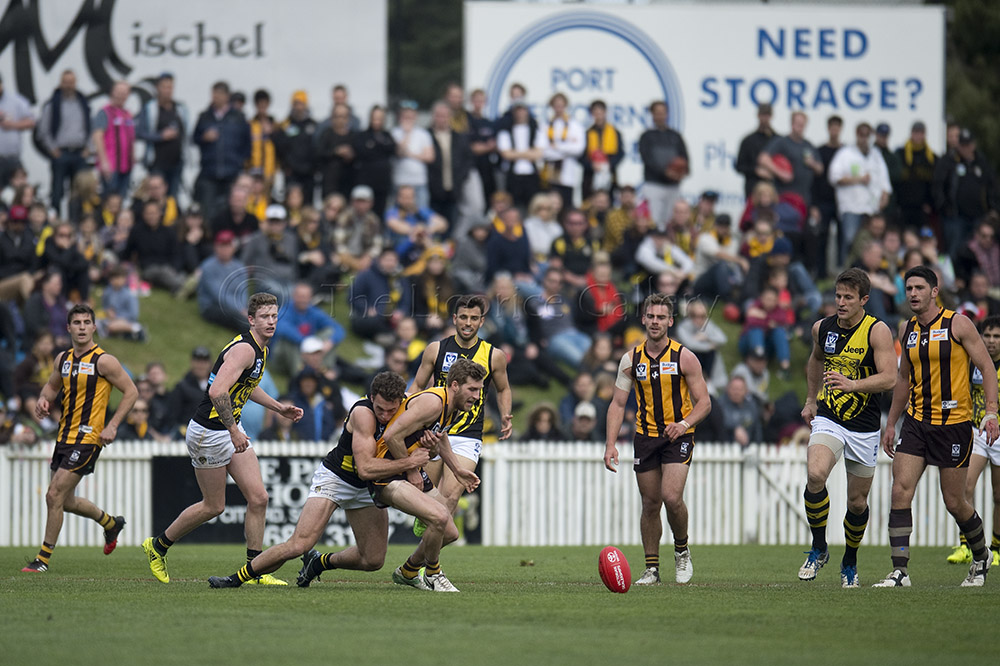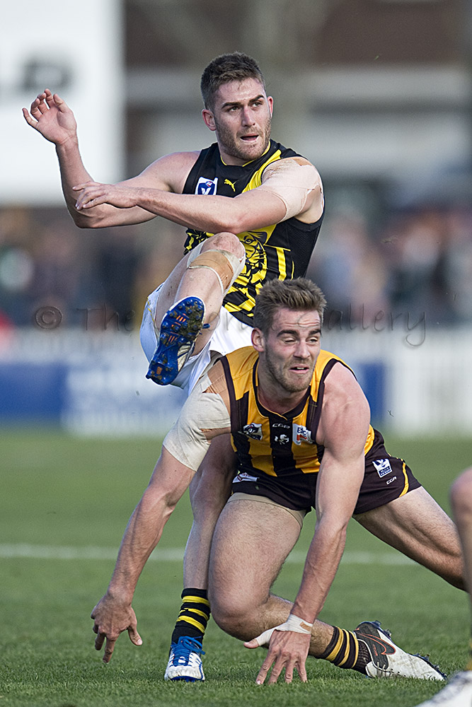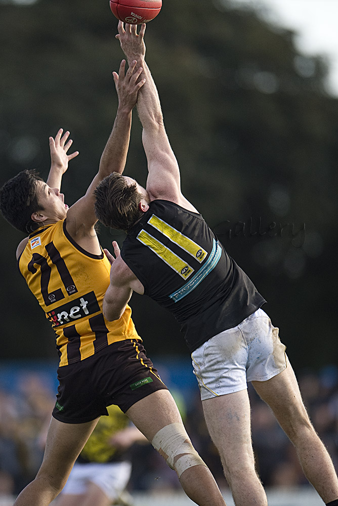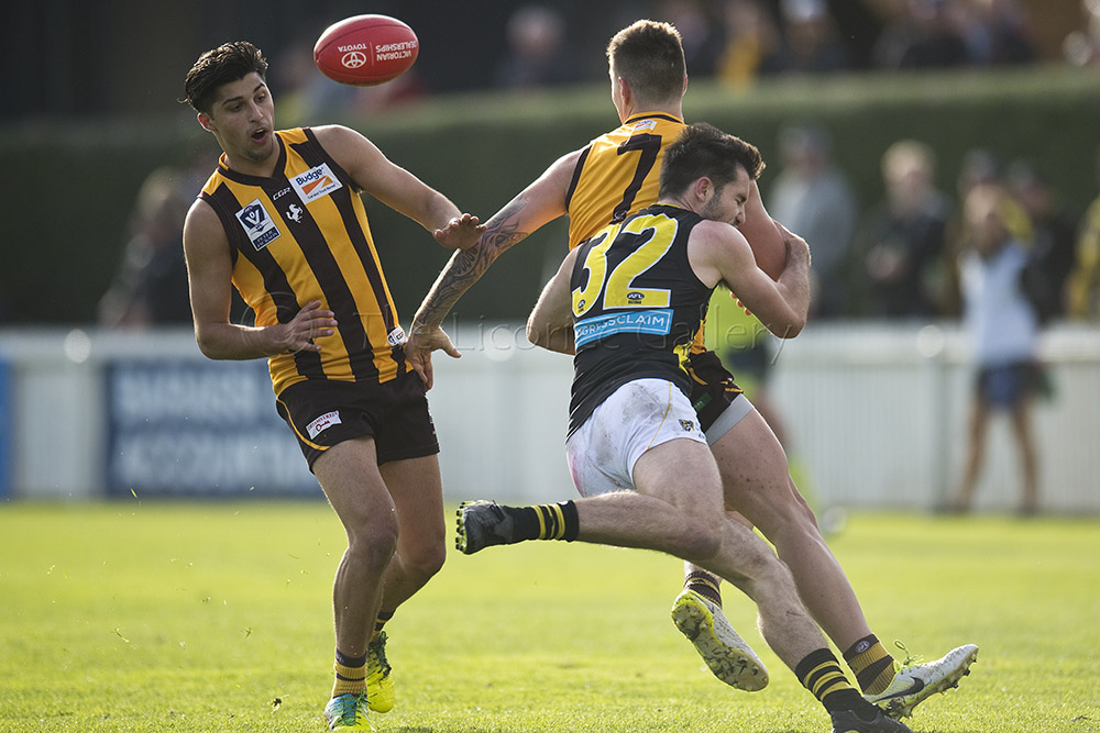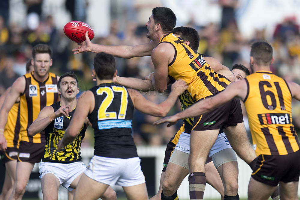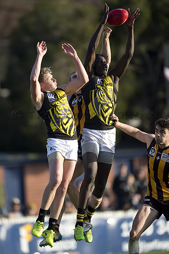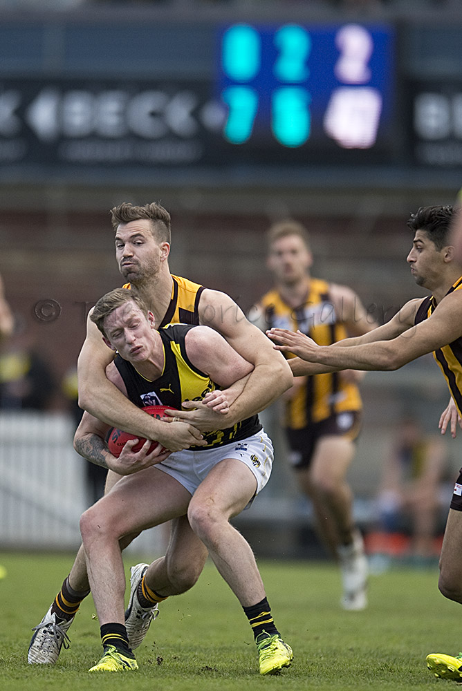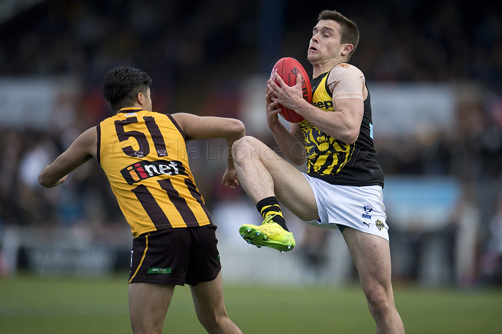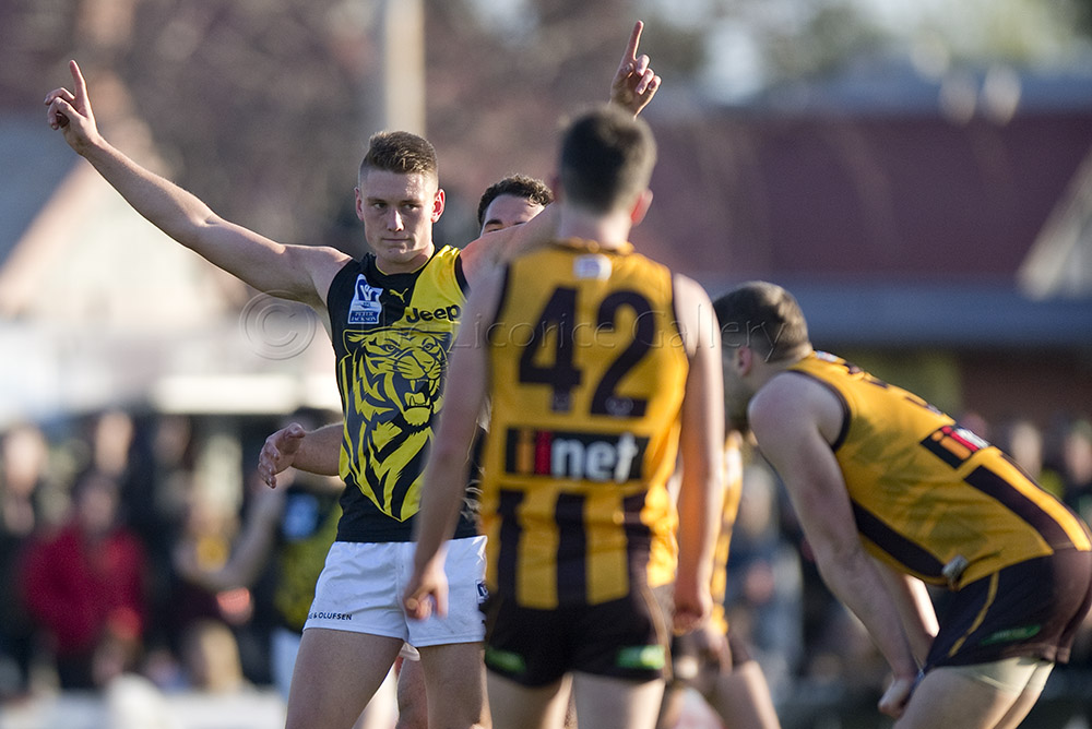 The Tigers didn't allow the Hawks any freedom and run with their tough and aggressive pressure at the ball carrier. Anthony Miles was again superb with a game-high 34 disposals and Jayden Short (22 touches) worked hard across half back and the wing. The Hawks matched the Tigers in the last quarter booting three goals with Oliver Hanrahan, Brendan Whitecross and Will Hams all working hard till the end. Pittonet battled manfully against the more experienced pair of Maric and Hampson while Mirra (2 goals) and defender Kurt Heatherley tried hard to make life difficult for their opponents.
