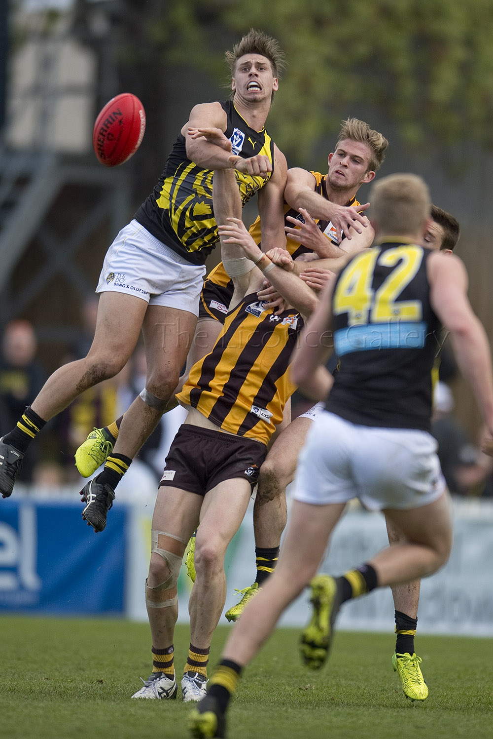 Hawk Kade Stewart (right) and Tiger Anthony Miles contest for the ball as Brendan Whitecross (left) and Sam Lloyd (right) await the outcome.