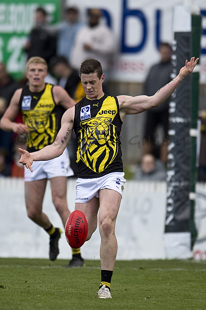 Richmond's Anthony Miles boots the Tigers forward, Miles will be pivotal in the Grand Final against Port Melbourne.