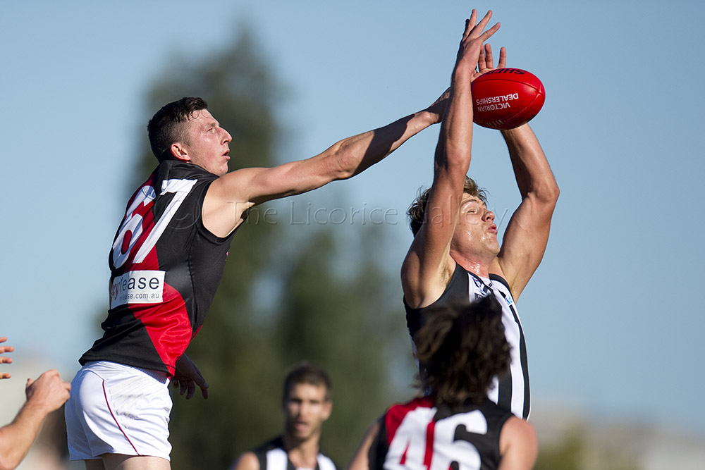 Pie's defender, Jackson Viola, attempts a 'speccy' over the Bomber's Shaun McKernan.