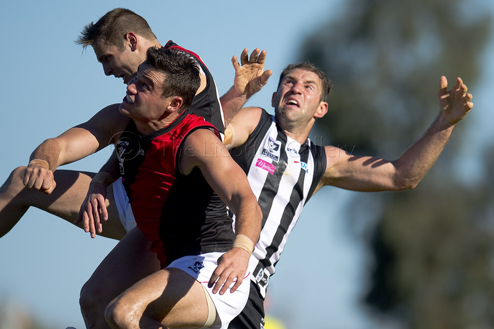 Former North Melbourne defender and now Bomber, Nathan Grima (centre), keeps an eye on the footy while holding out Collingwood forward Travis Cloke (right) in this marking contest.