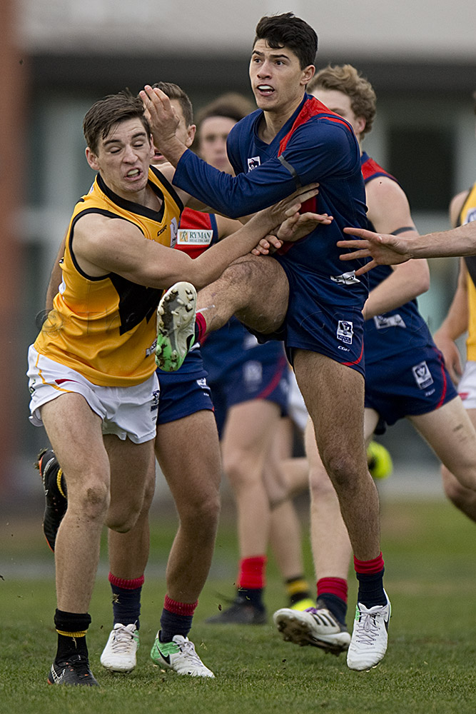 Coburg's Ryan Exon appears to elevate the sherrin to the amazement of Werribee's Jack Henderson.