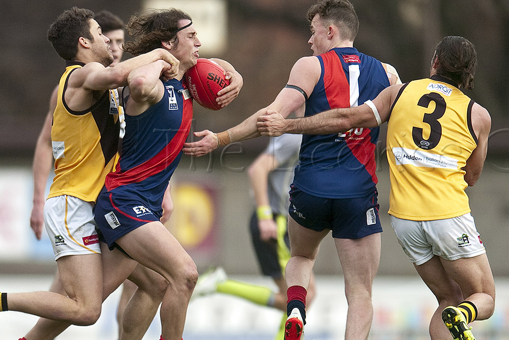 Jack Henderson of Werribee reaches for the sherrin in-between a couple of Coburg opponents.