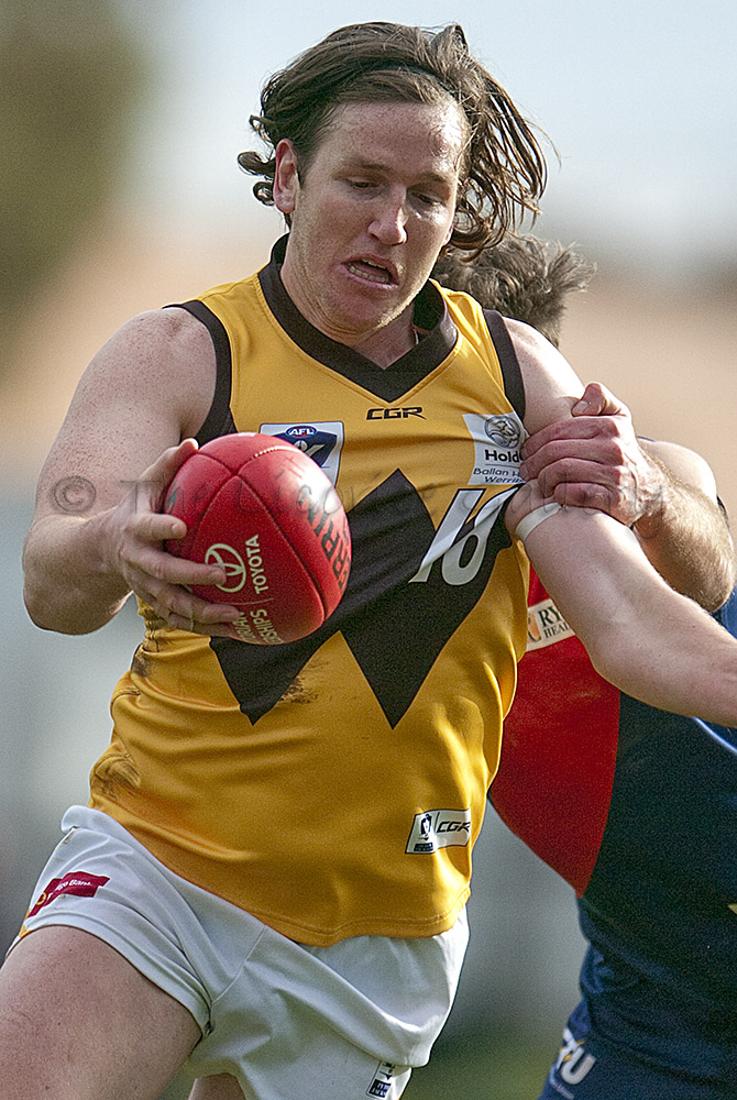Former Western Bulldogs and North Ballarat small forward, Andrew Hooper, now at Werribee, looks downfield for options.