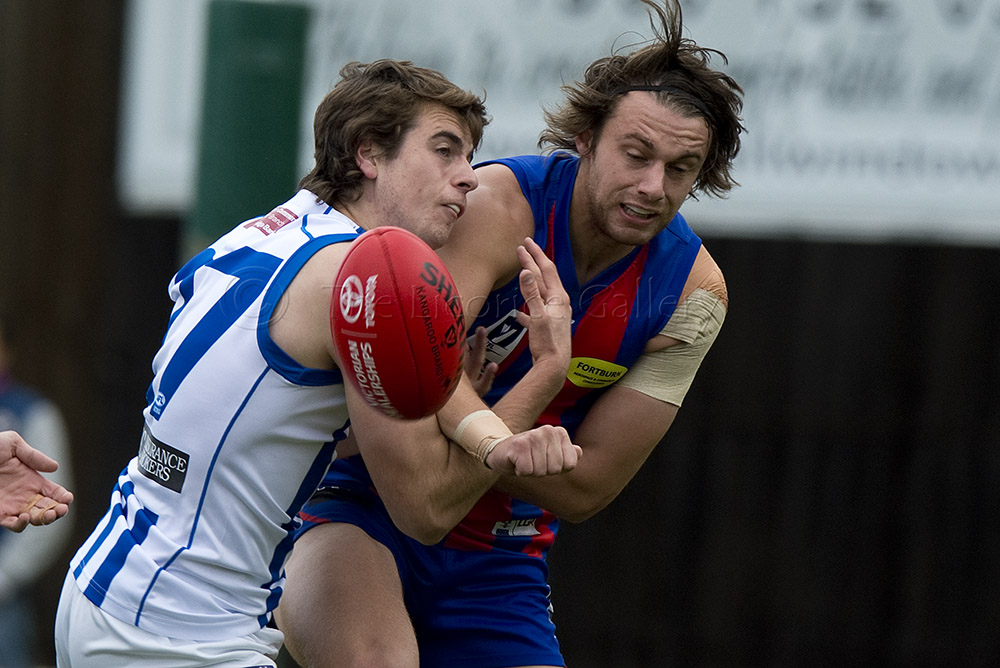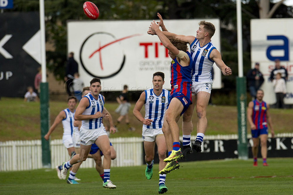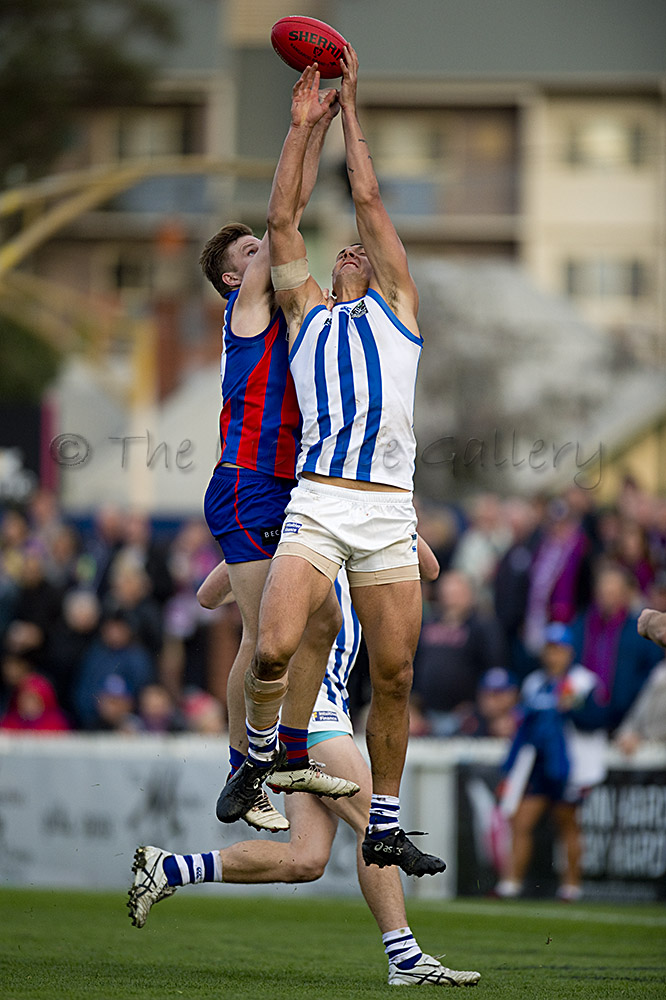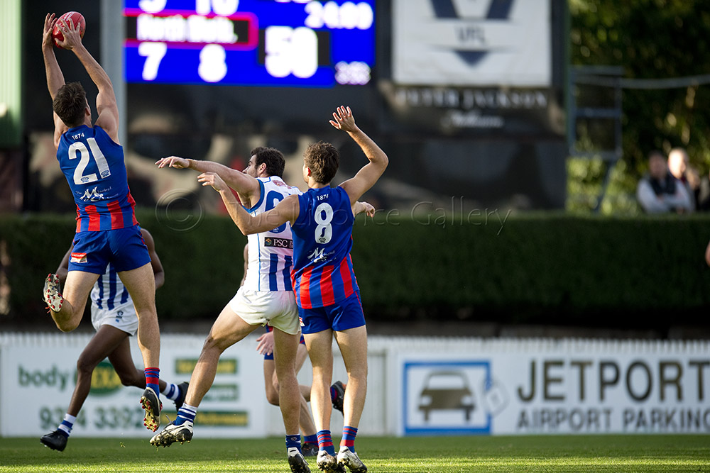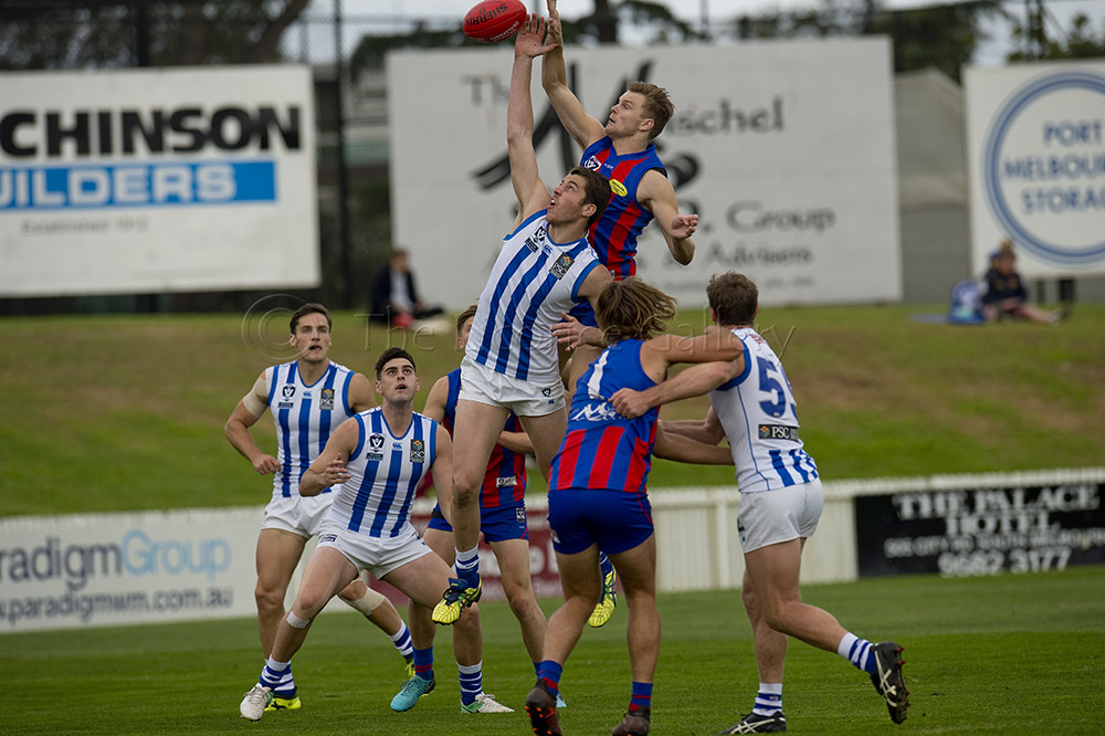 Port Melbourne's Guy Dickson competes with North Melbourne's Braydon Preuss.