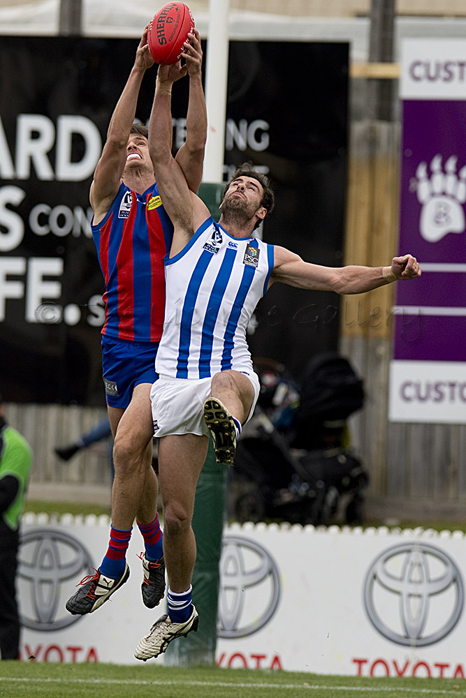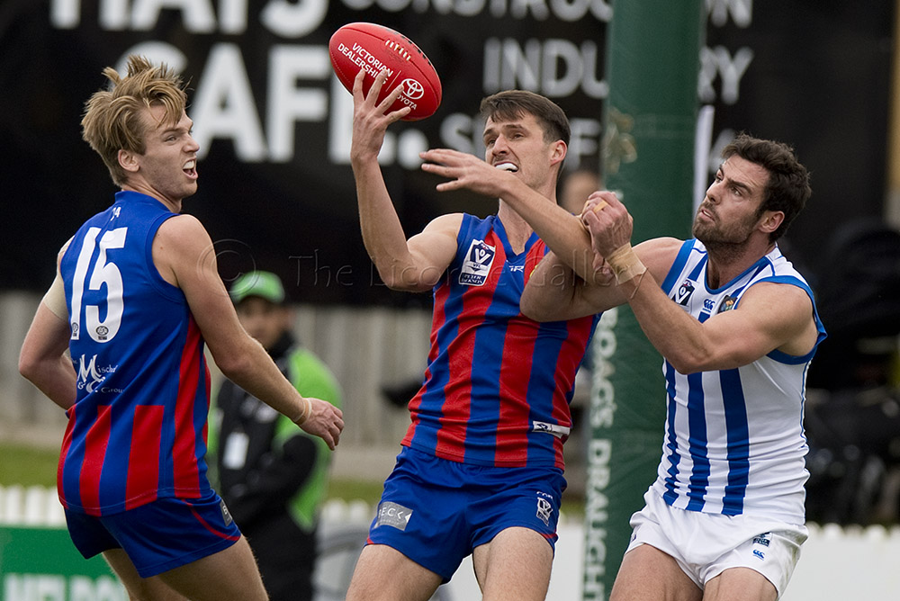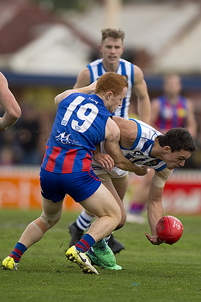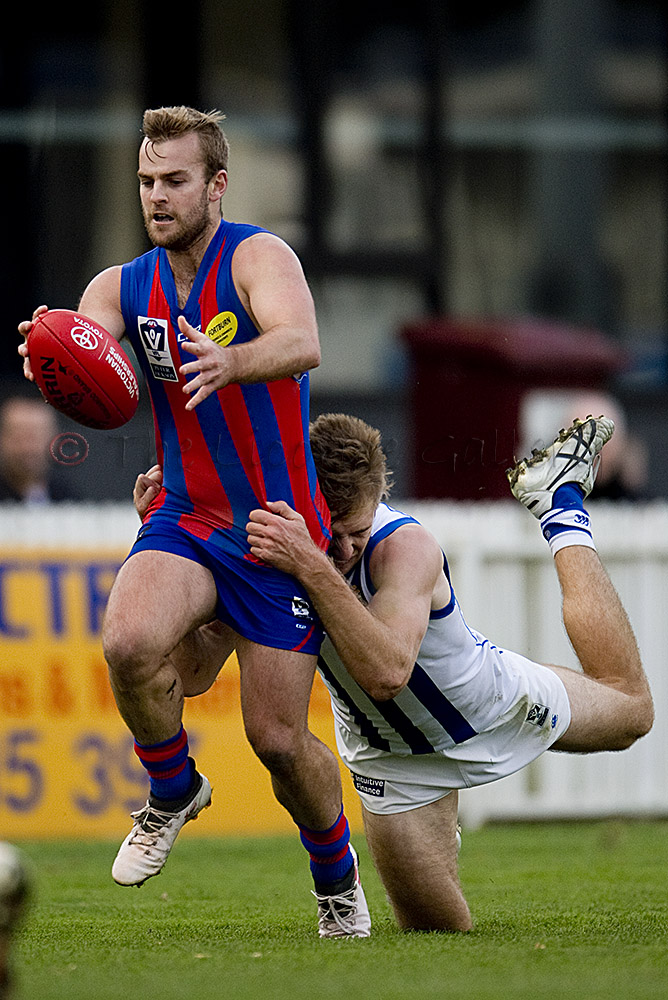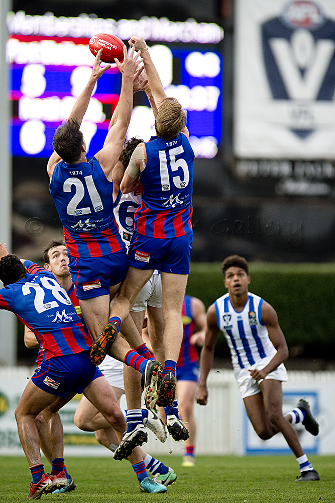 Port Melbourne's Guy Dickson competes with North Melbourne's Braydon Preuss.
