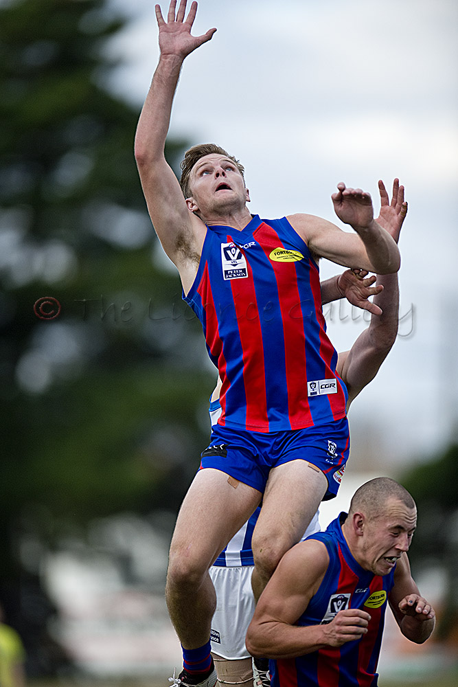 Port Melbourne's Guy Dickson climbs high above teammate Harvey Hooper.
