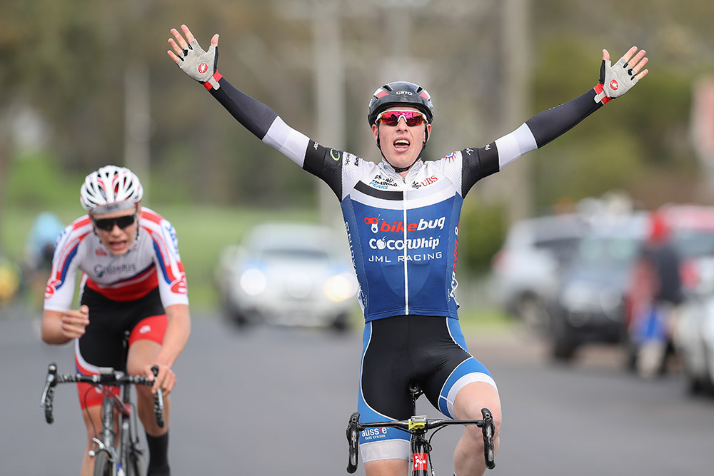 After crashing trying to avoid Cavanagh in front of him, tour leader Crome, got back on a spare bike and finished with the main bunch into Casterton. The stage was won by JML Racing’s, Jake Klajnblat, from Melbourne, in just one hour and 19:13 seconds over SASI/Callidus’s Liam Nolan and Oliver Real Foods, Nicholas Reddish.
