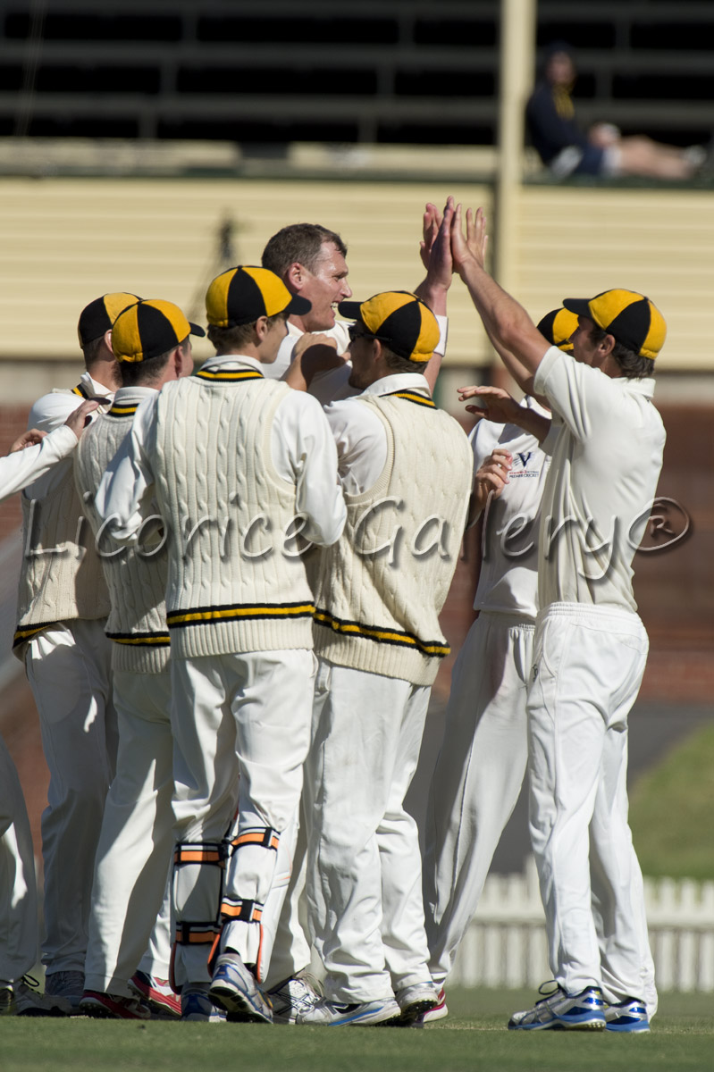 Monash Tigers celebrate after skipper, Alan Wise (centre), trapped Ian Holland in front just after play started on the second day.