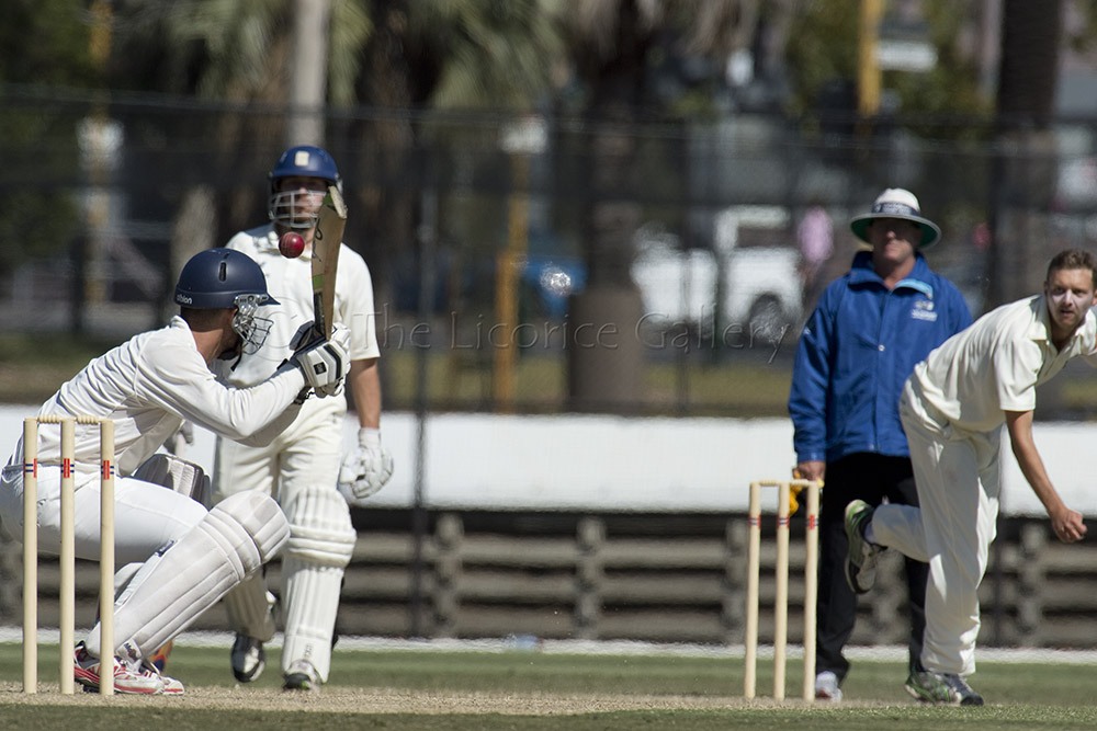 The Ram's Patrick Ahston evades a short delivery from Monash Tiger's paceman Matt Shimell.