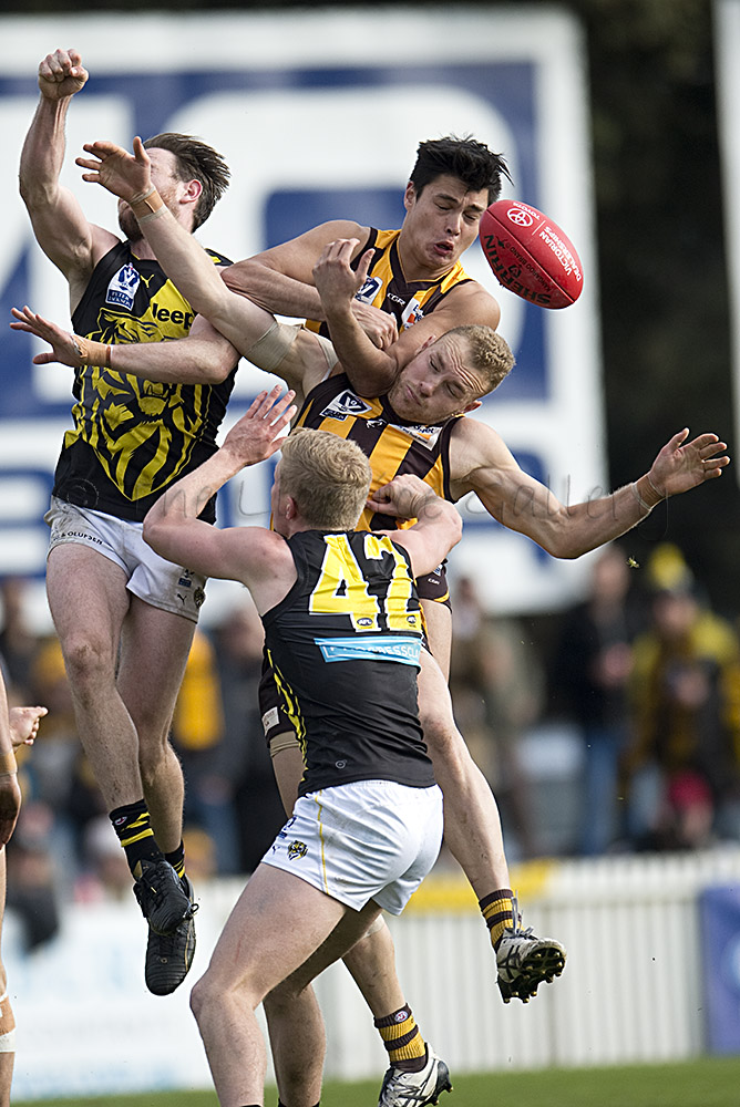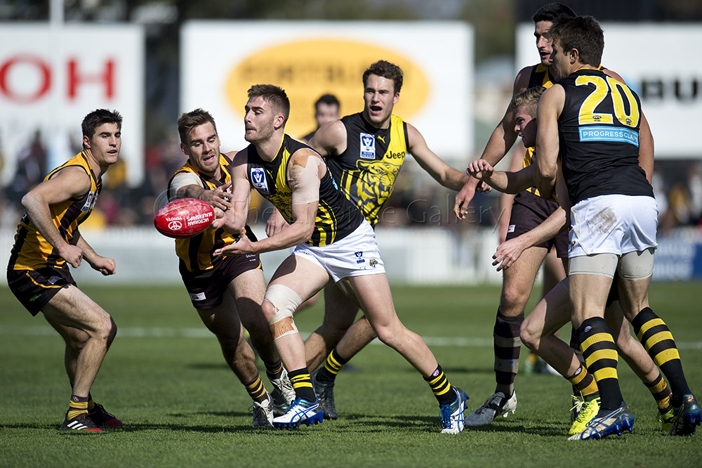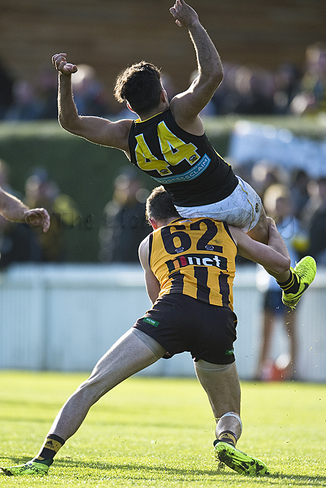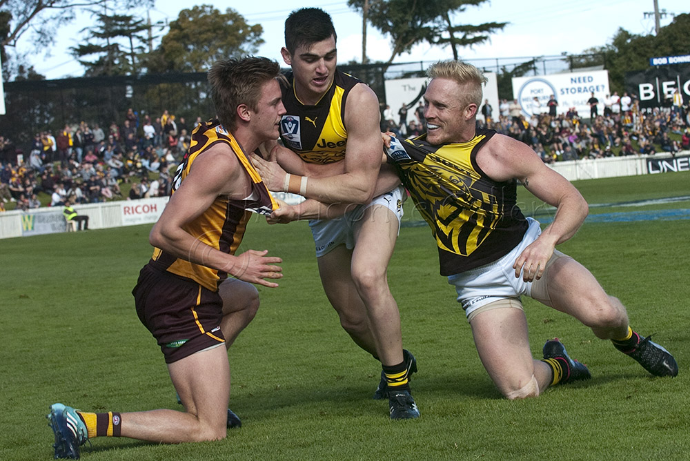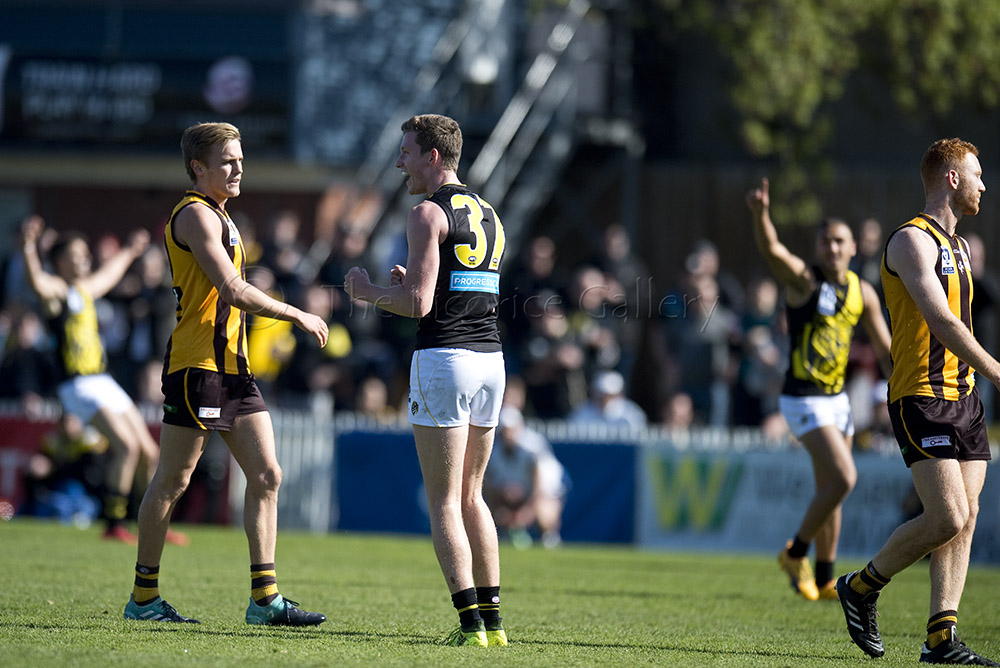 The Tigers didn't allow the Hawks any freedom and run with their tough and aggressive pressure at the ball carrier. Anthony Miles was again superb with a game-high 34 disposals and Jayden Short (22 touches) worked hard across half back and the wing. The Hawks matched the Tigers in the last quarter booting three goals with Oliver Hanrahan, Brendan Whitecross and Will Hams all working hard till the end. Pittonet battled manfully against the more experienced pair of Maric and Hampson while Mirra (2 goals) and defender Kurt Heatherley tried hard to make life difficult for their opponents.