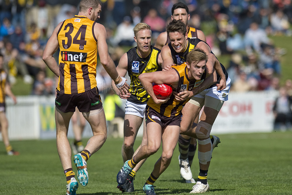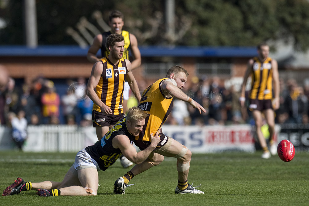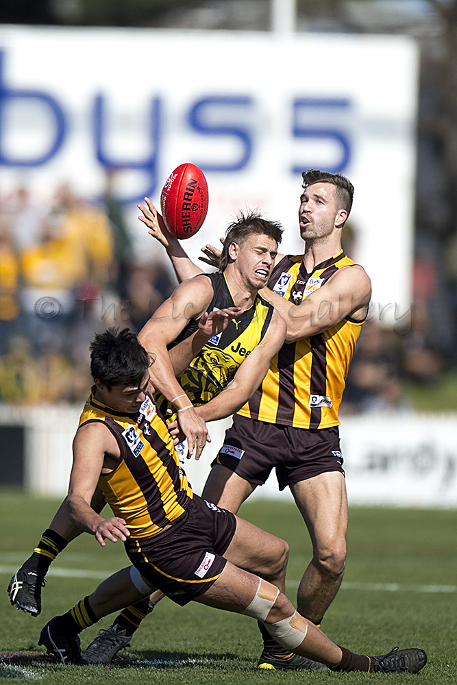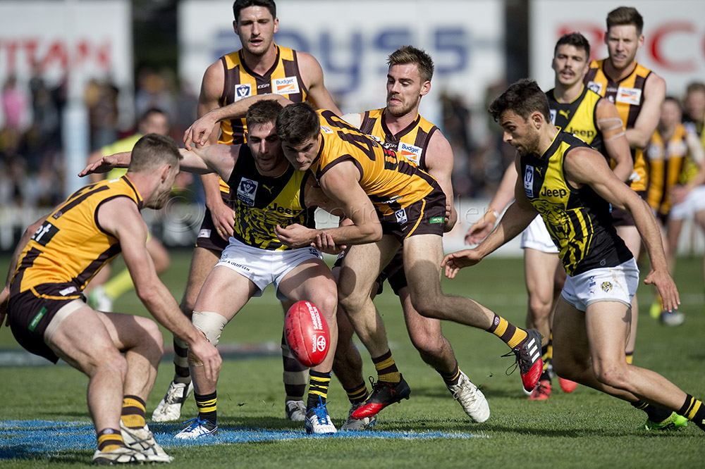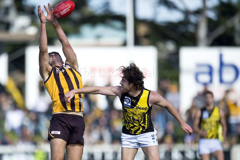 The Tigers didn't allow the Hawks any freedom and run with their tough and aggressive pressure at the ball carrier. Anthony Miles was again superb with a game-high 34 disposals and Jayden Short (22 touches) worked hard across half back and the wing. The Hawks matched the Tigers in the last quarter booting three goals with Oliver Hanrahan, Brendan Whitecross and Will Hams all working hard till the end. Pittonet battled manfully against the more experienced pair of Maric and Hampson while Mirra (2 goals) and defender Kurt Heatherley tried hard to make life difficult for their opponents.