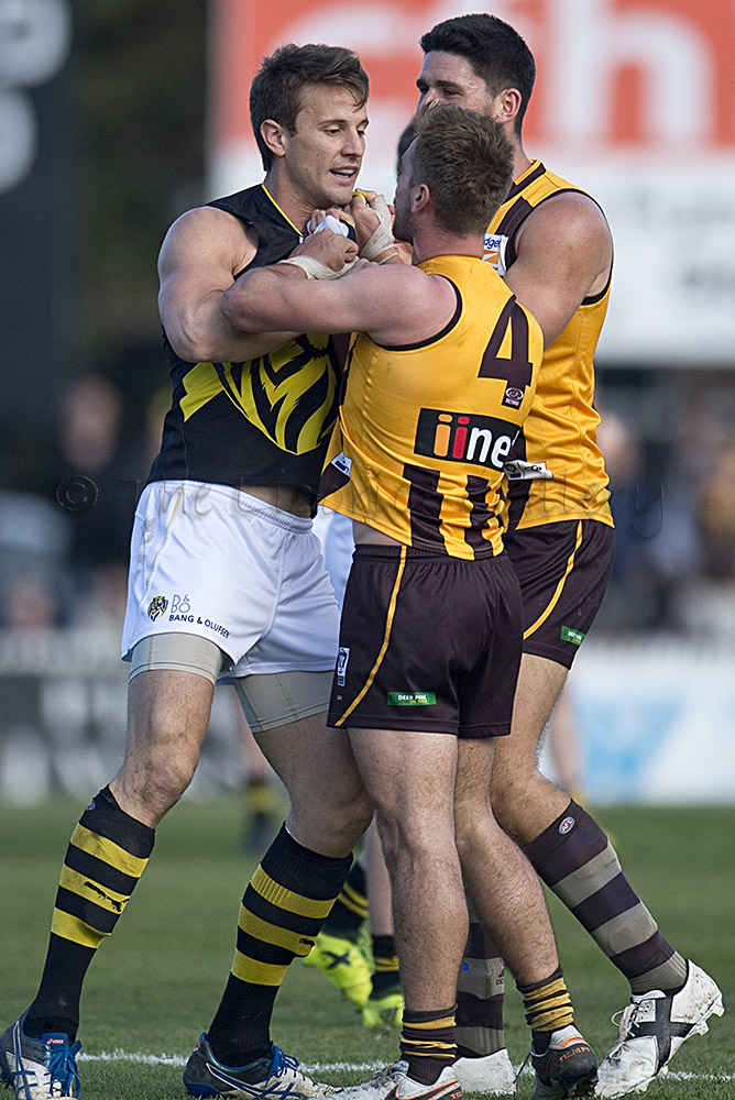 Tiger big man, Ivan Maric, wasn't letting Hawk's pair, Mitchell O'Donnell (4) and Marc Pittonet disrupt the Richmond onslaught.