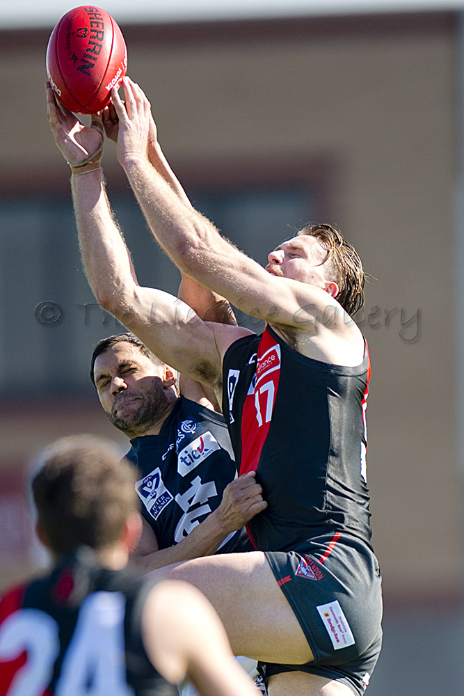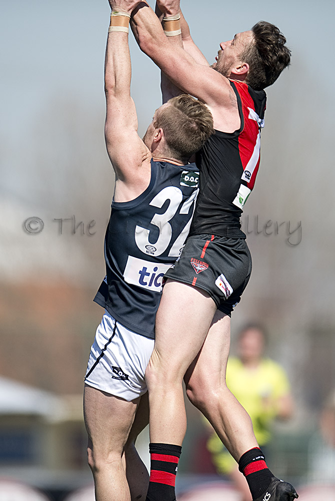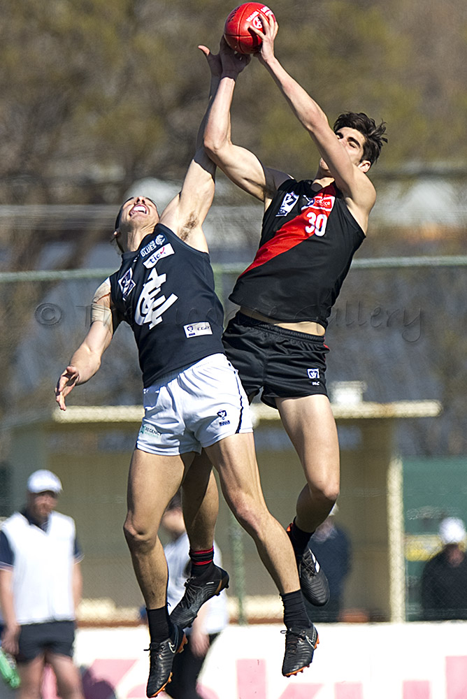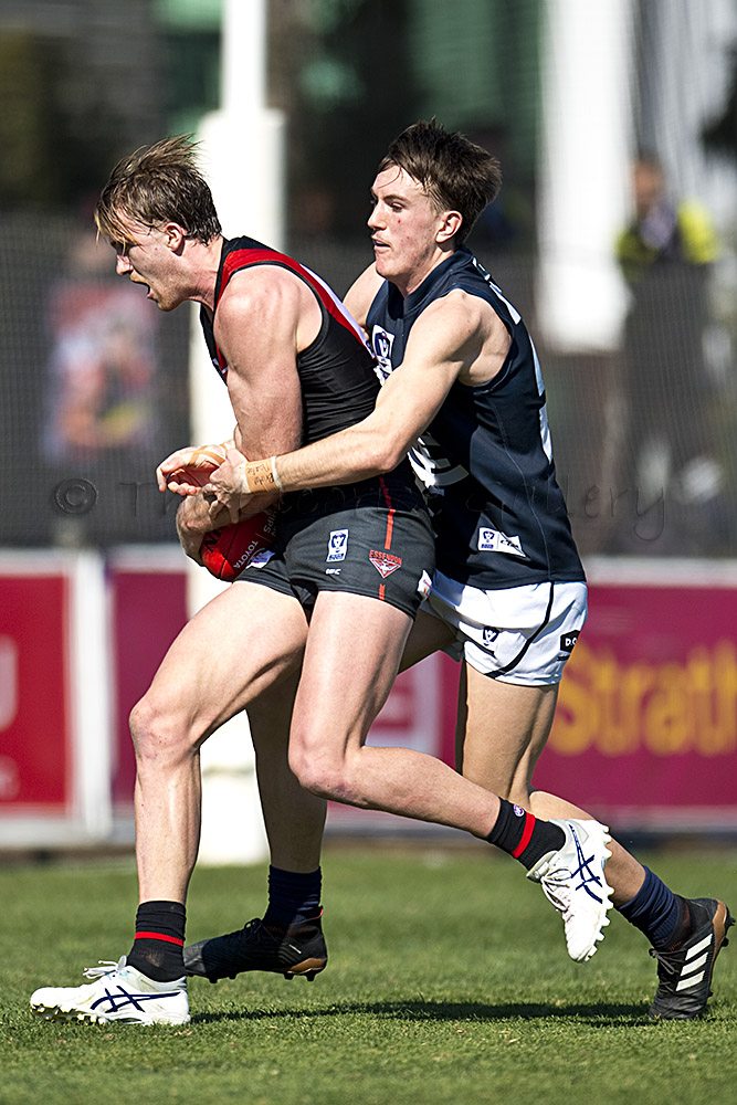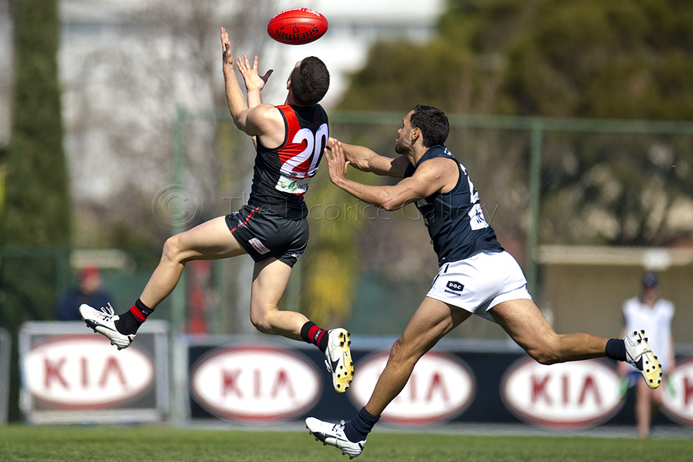Essendon defender, Brandon Zerk-Thatcher, out marks the Blue's Jesse Palmer. Zerk-Thatcher kept the dangerous Palmer goalless for the game.