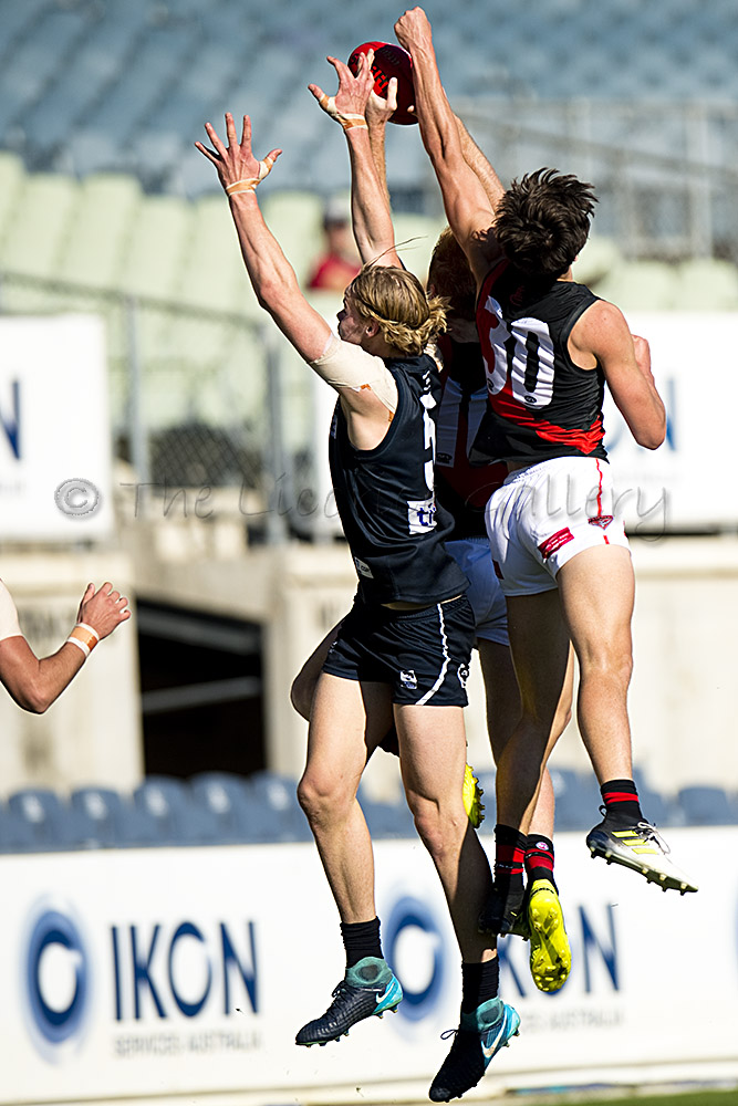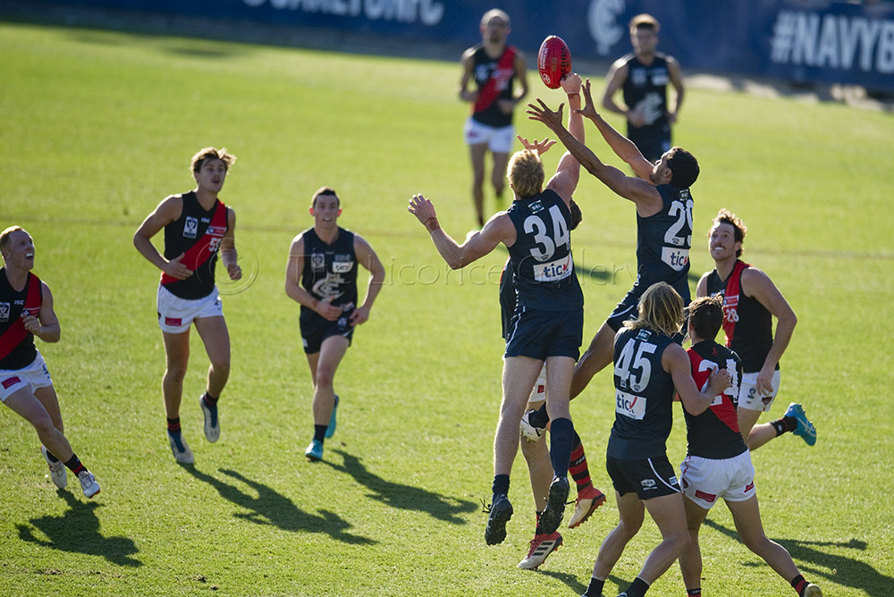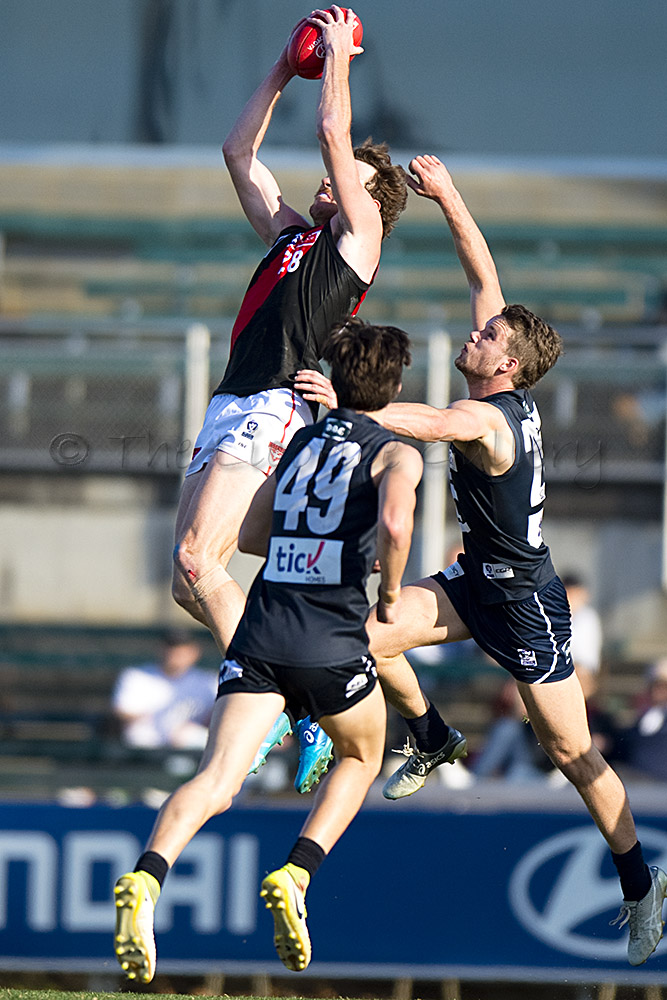 Essendon's, Alex Boyse, flies from behind with Blues pair, Andrew Phillips (34) and Jesse Glass-McCasker (43) defending.