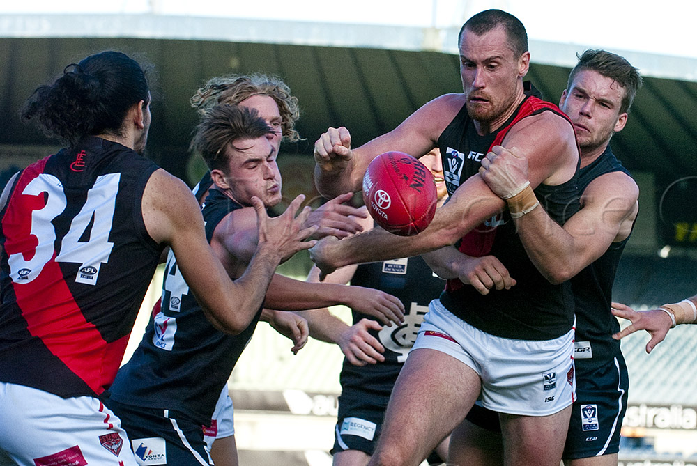 Bomber's bigman, Matthew Leuenberger, tries to get a handball out.