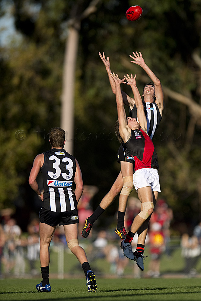 Collingwood's Ash Close flies high from behind Essendon's Jason Ashby as Collingwood's Rupert Wills awaits any crumbs.
