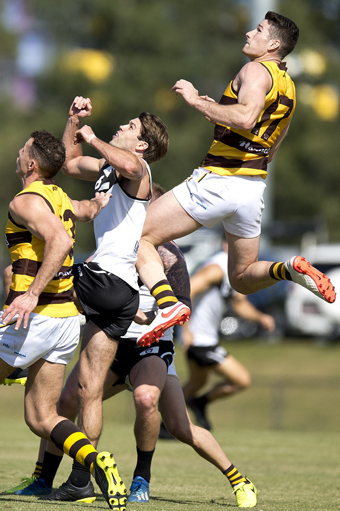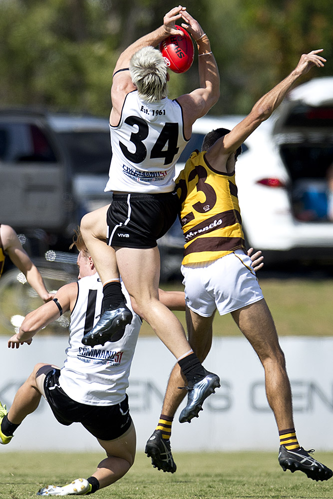 Southport's Billy Gowers flies high in this attempt to mark with Aspley's Michael Hutchinson.