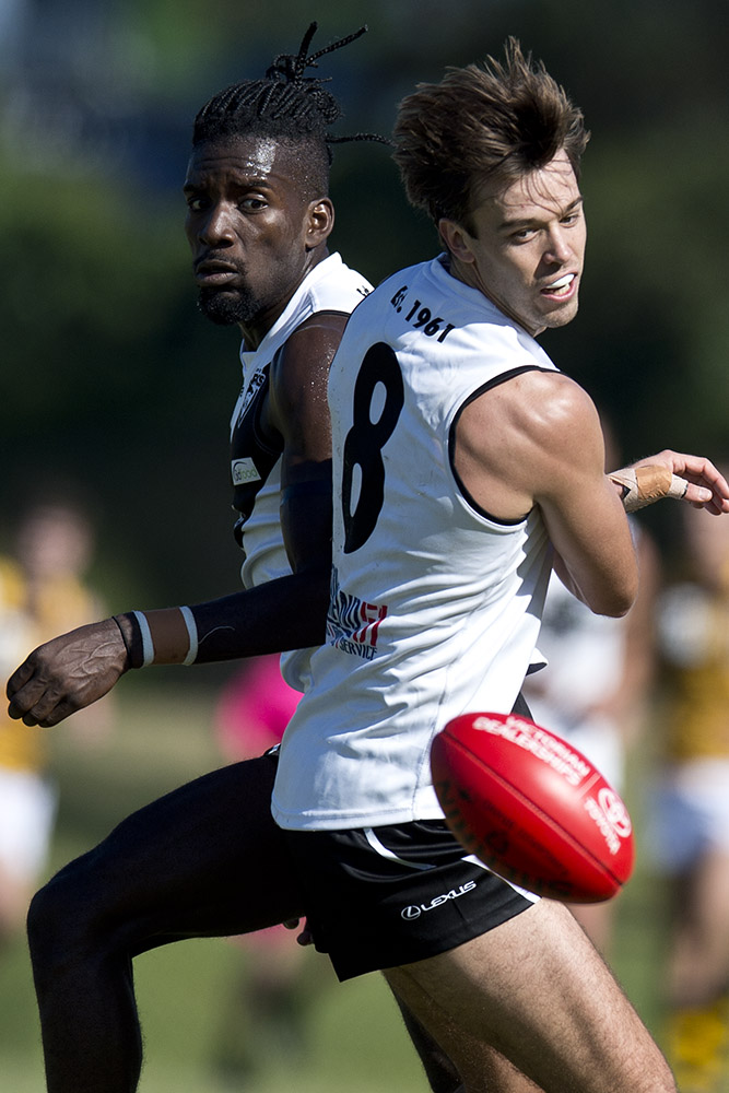 Eyes only for the footy: Southport duo Kwaby Boakye (left) and Seb Tape keep a close watch on the sherrin during their win over Aspley.