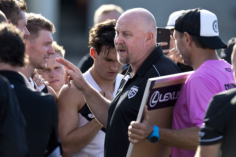 Southport coach Steve Daniel lays down the law to his charges at three-quarter-time with the Sharks leading Aspley by 18-points.