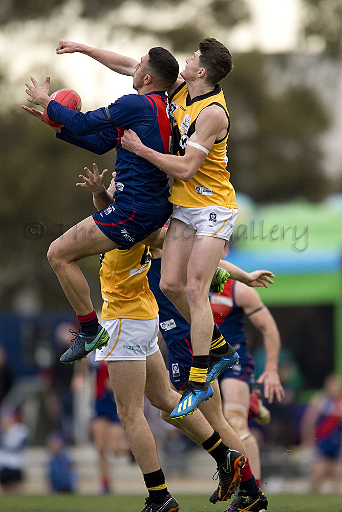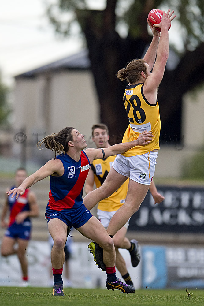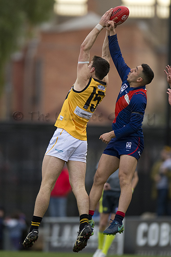 Werribee defender, Sam Collins, marks in front of Coburg's Hisham Kerbatieh. Collins is having a fine season in defence for the Tigers.