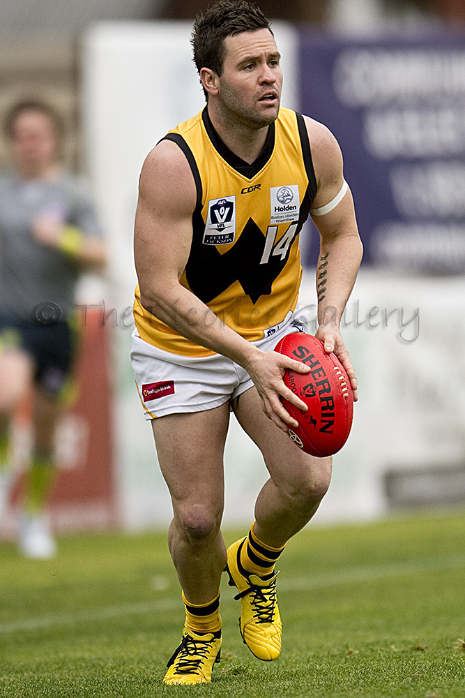 Former Western Bulldogs and North Ballarat small forward, Andrew Hooper, now at Werribee, looks downfield for options.